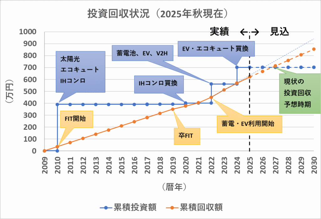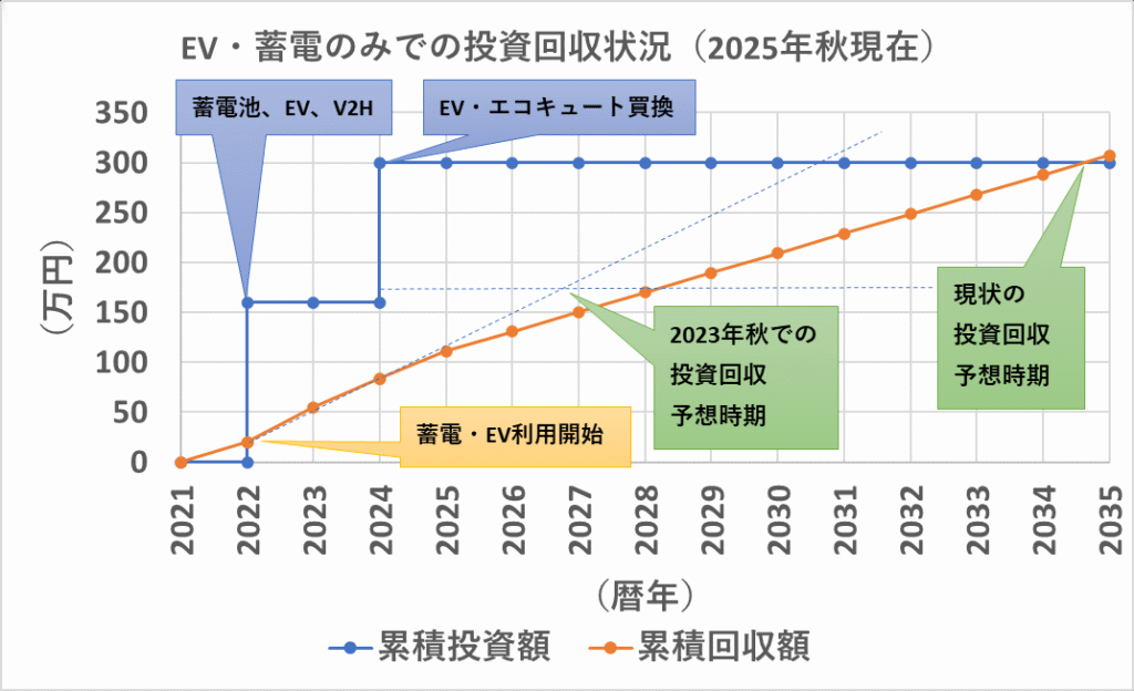 ここでは、これまでの太陽光、オール電化、EV、据置蓄電池、V2Hなどへの投資と、