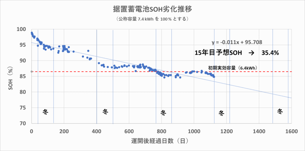 図3のとおり、寒い冬の方がSOH劣化が早く進む傾向が見えています。