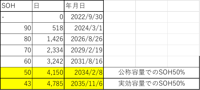 保証性能である「15年目のSOH50%」は、現状満足できないとの見込みとなっています。