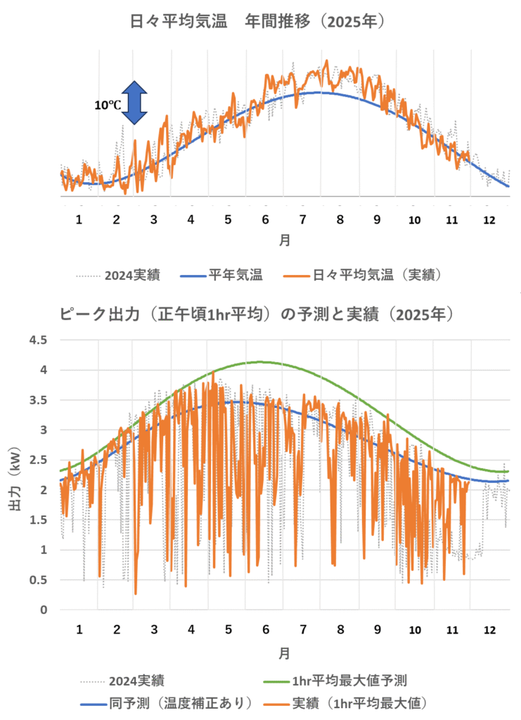 太陽光発電のピーク出力を示します(日々の平均気温を併記)。