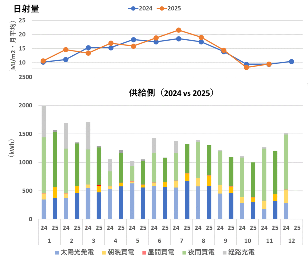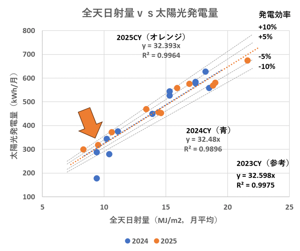 図3 全天日射量vs太陽光発電量(青・2024年、オレンジ・2025年)
