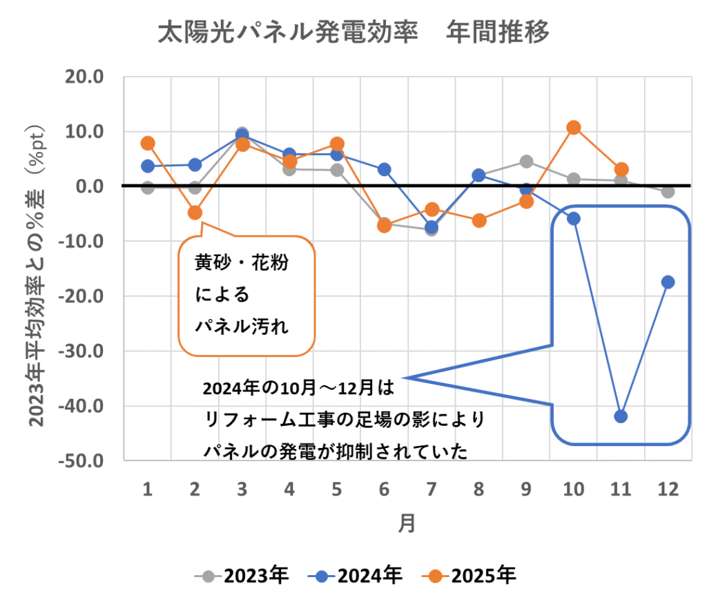 図4 太陽光パネル発電効率 年間推移(灰・2023年、青・2024年、オレンジ・2025年)