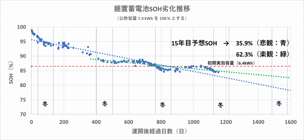 となり、ニチコンの保証である 15年で SOH 50 % を楽観予想はオーバーしていますv