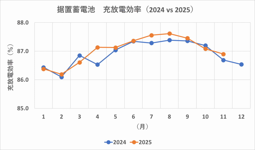 図6 据置蓄電池 充放電効率の推移(青・2024年、オレンジ・2025年)