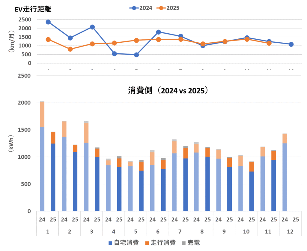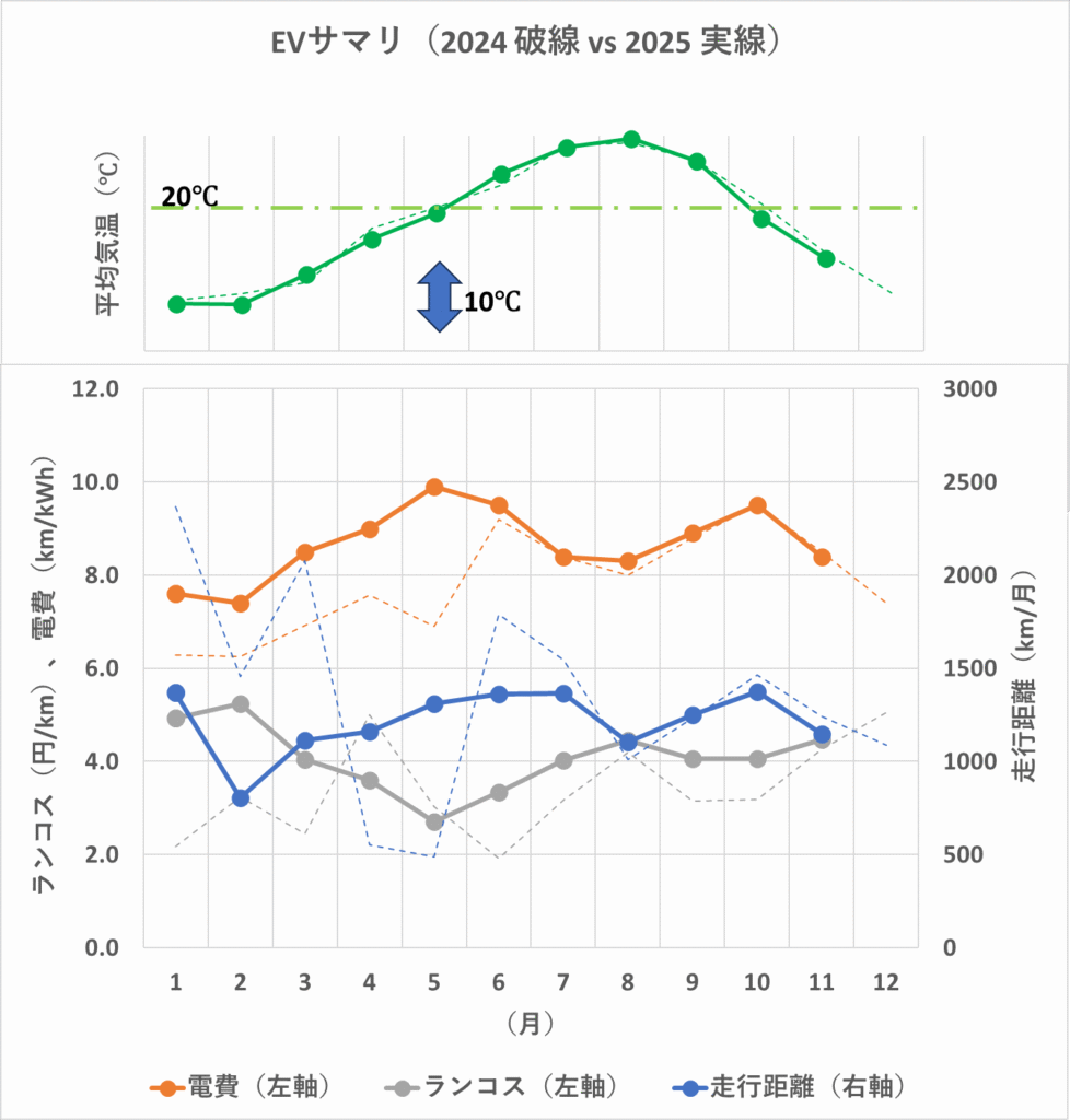 前月10月の9.5 km/kWhから、この11月は8.4 km/kWhまで悪化しました。