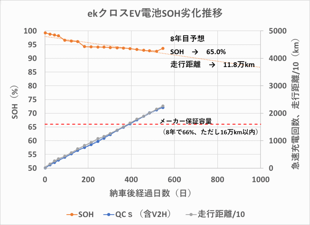 メーカー保証は、8年=2,920日以内でSOH≧66%(但し走行16万km以内)ですが、