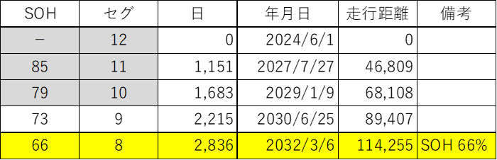 走行用電池のセグ欠け予想時期とその時の走行距離です。