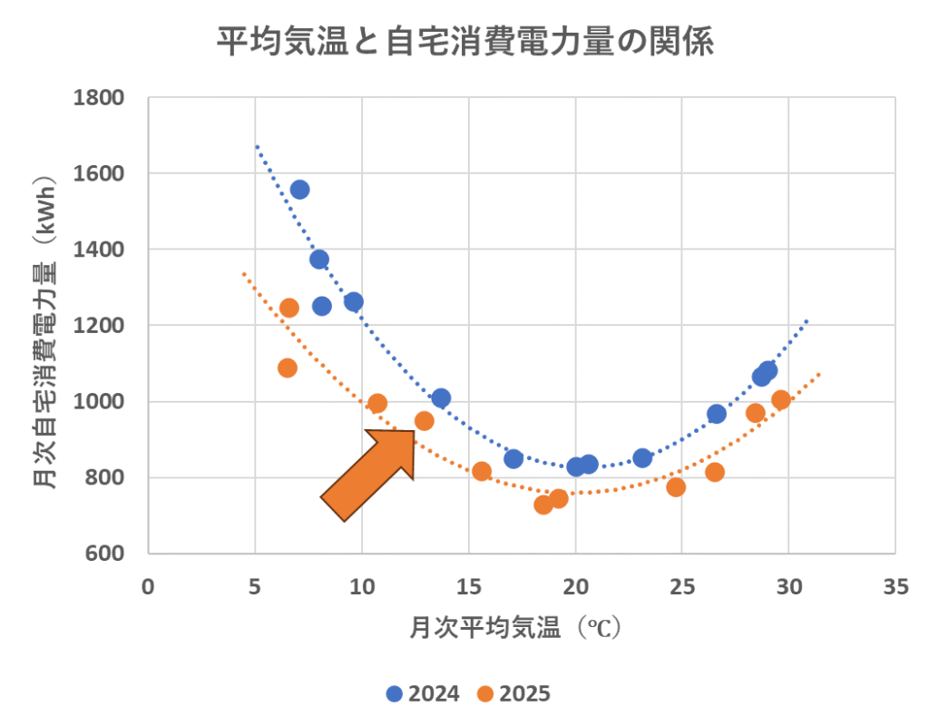 図9 平均気温と自宅消費電力量の関係(青・2024年、オレンジ・2025年)