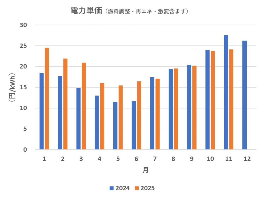 電力単価は、前月10月よりもやや高く、しかし昨年11月よりは大幅に安価に出来ました。